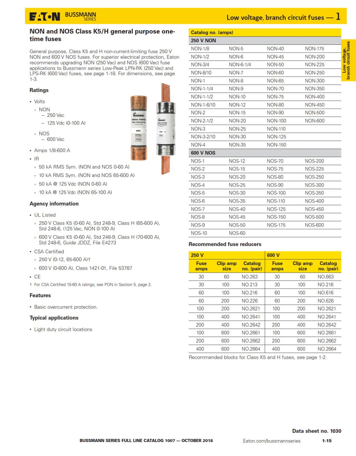 General purpose,Class K5 and H non-current-limiting fuse 25o vNON and 60o v NOS fuses. For superior electrical protection, Eatonrecommends upgrading NON(250 Vac) and NOS (6O0 Vac) fuseapplications to Bussmann series Low-Peak LPN-RK(250 Vac) andLPS-RK(600 Vac) fuses,see page 1-18.For dimensions,see page1-3.
